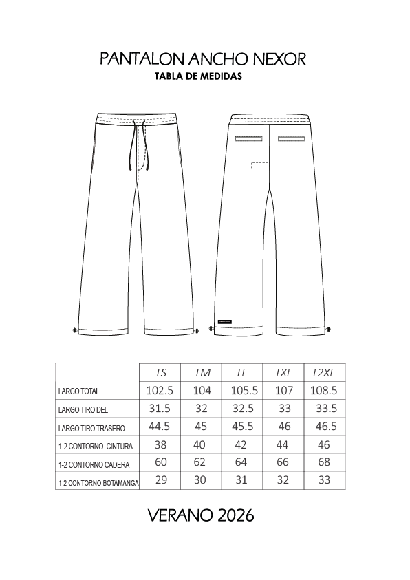 Corte recto, amplio. Bolsillos. Cintura regulable.